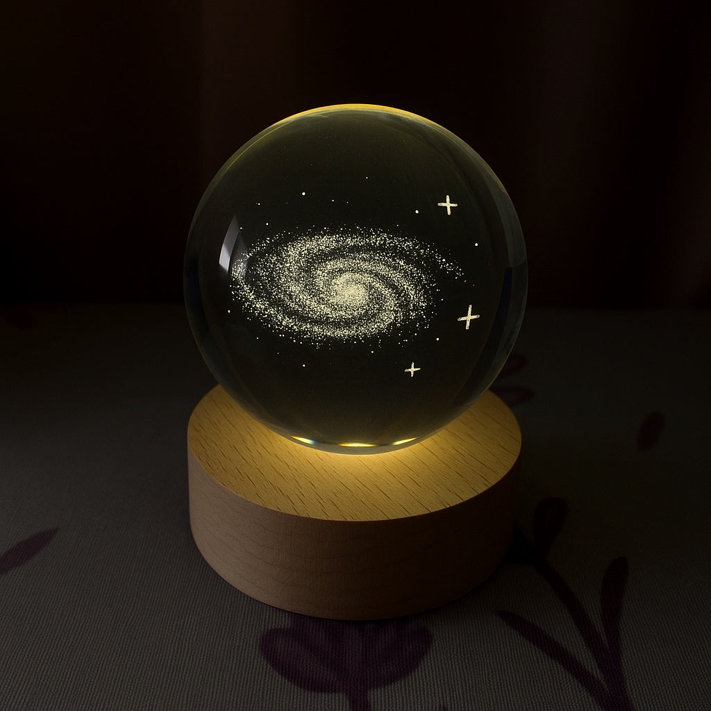 Each sphere is precision-engraved with a stunning 3D galaxy design, suspended within flawless crystal. Resting on its smooth wooden base, it radiates warmth and sophistication — transforming any room into a sanctuary of light and wonder.